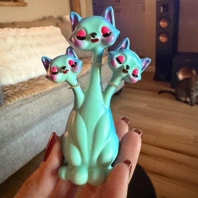 Step into the world of retro kitsch weirdness with these one of a kind 3 headed cat figurines. This surreal, whimsical collectible is perfect for lovers of weird art, kitschy decor, and unusual home accents.