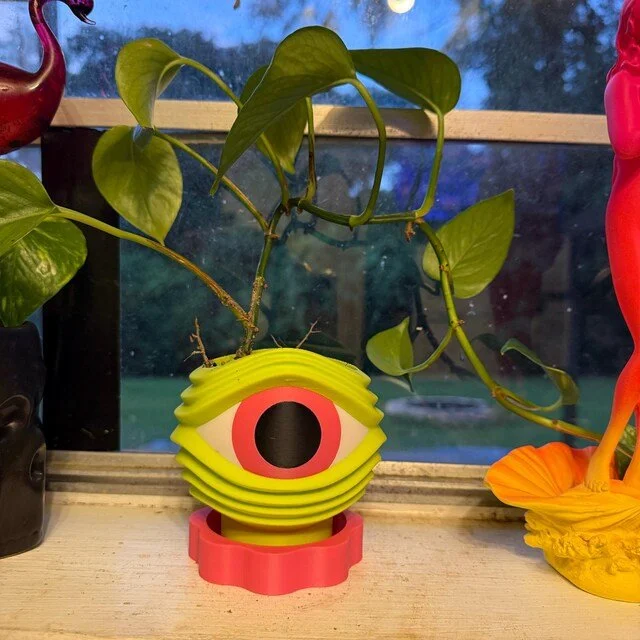 Each alien eye planter is a labor of weird little love! I designed it from scratch in a 3D sculpting program, and it takes 28 hours to print in three different colors using eco-friendly PLA. The slow process and layered details make every one feel like a tiny piece of space art.