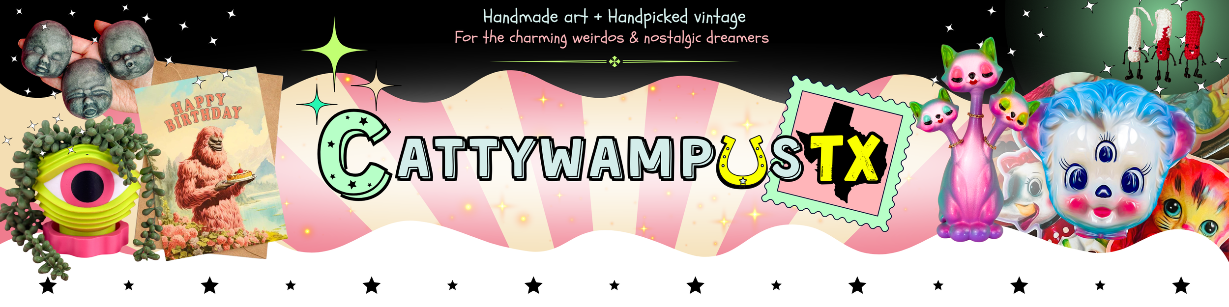 In addition to my handmade work, I also source and curate vintage kitschy goods and home decor that fit the spirit of the shop. Every item is chosen by me to complement the overall aesthetic and feeling of CattywampusTX.